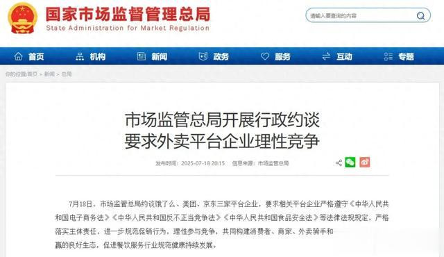据市场监管总局7月18日消息,该局今日对饿了么、美团、京东三家外卖平台企业进行行政约谈,要求严格遵守《电子商务法》《反不正当竞争法》等法律法规,规范促销行为,理性竞争。这场监管风暴的背后,折射出外卖行业多年未解的“内卷”困局。